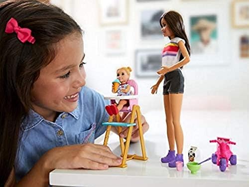 Product Description Barbie Skipper Babysitters Inc. dolls and playsets let kids explore their nurturing side as the babysitter. Each comes with a Skipper or friend doll, a baby or toddler doll and furniture and accessories matched to classic childhood moments. This feeding-themed set has all the ingredients for playtime fun with a toddler doll that kids can help to feed herself! Simply seat the small doll in the high chair and place the cup, spoon or ice cream cone in her hand -handles let her hold the items. Key Features: Play out classic babysitting moments with this feeding-themed Barbie Skipper Babysitters Inc playset that feeds kids imaginations with a fun feature!,This toddler doll can feed herself with a little help from kids -they just move the lever in her back to watch her arm move up and down in an eating motion!,Place the small doll in her high chair when it's time to eat -a hole in the back of the chair let's kids easily move the lever!,There's an ice cream cone, spoon and cup with handles the dolls can hold!,A carton of milk, a box of cereal and a bowl add additional ingredients for storytelling, plus plug-and-play design holds them in place for playtime action and easy cleanup,A tricycle adds to the fun options for babysitting play with wheels that really roll,Skipper doll wears a casually cool outfit with a striped t-shirt, black shorts and purple sneakers that match the purple streak in her hair; the toddler doll is adorable in a striped dress decorated with hearts and matching sneakers,Collect the Barbie babysitting dolls and toys to inspire imaginations and explore new possibilities because when a girl plays with Barbie, she discovers everything she can become (each sold separately, subject to availability) This product is designed with premium quality, ensuring durability and superior performance.
