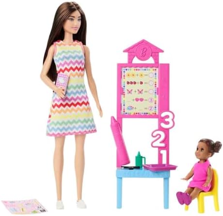 Product Description Get ready to learn with the Barbie Teacher fashion doll! Barbie teaches her toddler student in her removable printed dress and shoes. The set includes stickers that you can place on the board to bring the teaching storytelling to life! With other classroom accessories like safety scissors, backpack, and a chair for the toddler student, imaginations can play out a world full of storytelling possibilities and career opportunities with this powerful doll, ready to inspire kids to be anything! Doll cannot stand alone. Key Features: You can be a Teacher with the Barbie Teacher Set!,This set includes Barbie and her adorable toddler doll student with classroom career-themed play pieces!,With the teaching board accessory, Barbie can teach her student with the teaching-inspired sticker set.,Other classroom accessories include a chair, backpack, safety scissors, glue, notebook, and a lunch plate.,The doll and accessories set makes a great toy for kids 3 years old and up, especially those who love nurturing and leadership! This product is designed with premium quality, ensuring durability and superior performance.