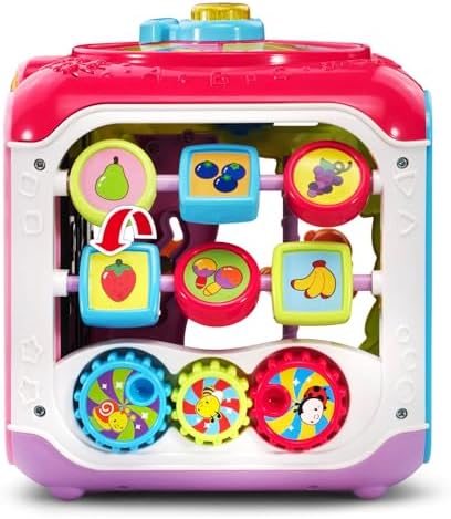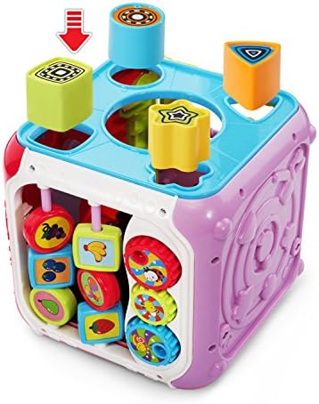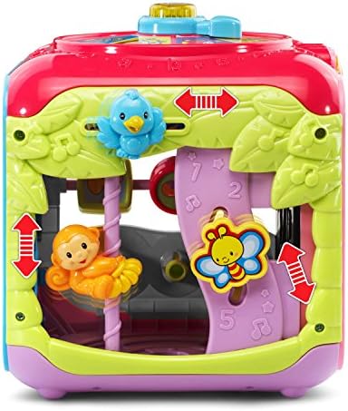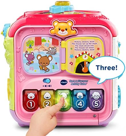 Product Description The Sort and Discover Activity Cube by VTech is five sides of fun! Your little one will love exploring seven fun activities and two electronic panels that introduce colors, numbers, animals and more. Turn the book page, twist the spinner and slide the animals to develop fine motor skills. The activity cube also develops hand-eye coordination with the shape sorter and colorful shape blocks. Requires 2 A batteries (batteries included for demo purposes only, new batteries recommended for regular use). Key Features: The Sort and Discover Activity Cube features five sides of fun activities; features 75+ songs, sounds, melodies and phrases,Your little one will love exploring seven fun activities and two electronic panels that introduce colors, numbers, animals and more; 5 piano keys introduce numbers, colors and music,Turn the book page, twist the spinner and slide the animals to develop fine motor skills; book page plays two nursery rhymes; spinner lights up and introduces animals and objects,The activity cube also develops hand-eye coordination with the shape sorter and colorful shape blocks; includes 4 colorful shape blocks,Requires 2 A batteries (batteries included for demo purposes only, new batteries recommended for regular use); intended for ages 9 months to 3 years Product dimensions 9.6" x 9.3" x 8.7" This product is designed with premium quality, ensuring durability and superior performance.