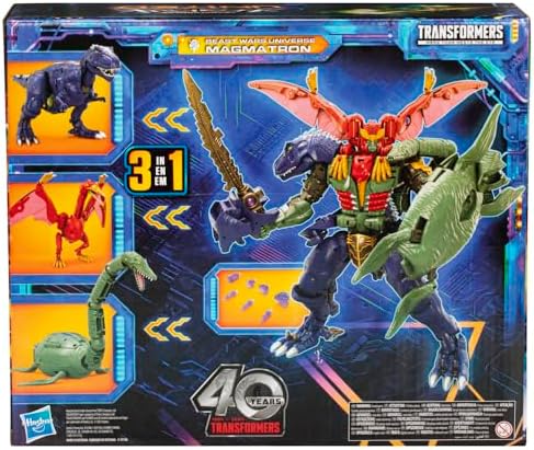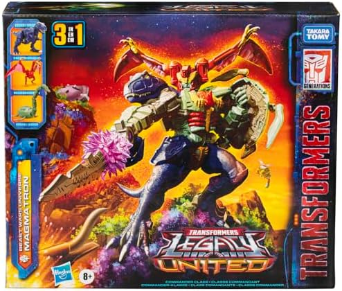 Product Description Unite your favorite characters from across the world of Transformers robots into your collection with the Transformers Legacy United Commander Class Beast Wars Universe Magmatron action figure! This 10-inch Beast Wars Universe Magmatron action figure separates into Beast Wars Universe Skysaurus, Beast Wars Universe Landsaurus, and Beast Wars Universe Seasaurus figures. Comes with Magma Blade, sword hilt, and blast effect accessories that attach in both modes. This figure is inspired by the character from the animated series, Beast Wars Neo: Super Lifeform Transformers, and features articulated head, arms, and legs for awesome action poses. Key Features: BEAST WARS UNIVERSE MAGMATRON ACTION FIGURE: This 10-inch (25.4 cm) Beast Wars Universe Magmatron toy features deco and detail inspiration from the animated series, Beast Wars Neo: Super Lifeform Transformers,3-IN-1 CONVERTING TRANSFORMERS TOY: This Transformers action figure is a combiner that separates into three dinosaur figures: Beast Wars Universe Skysaurus, Beast Wars Universe Landsaurus, and Beast Wars Universe Seasaurus,CONVERT TO DINOSAUR COMBINER BEAST WARS MAGMASAURUS: Convert and combine the dinosaur figures into the fused dinosaur mode, Beast Wars Magmasaurus, in 33 steps,AWESOME ACCESSORIES: This Beast Wars Universe Magmatron Transformers figure comes with Magma Blade, sword hilt, and 7 blast effects,ARTICULATED FOR PLAY AND DISPLAY: Transformers figures feature articulated heads, arms, and legs for action poses,CELEBRATE THE LEGACY: Transformers Legacy United honors 40 years of Transformers animated history! Collect other Legacy: United figures to unite your collection (each sold separately, subject to availability),GIFT TRANSFORMERS COLLECTIBLES: This Beast Wars Universe Magmatron action figure toy makes a great collectible figure gift for any Transformers fan This product is designed with premium quality, ensuring durability and superior performance.