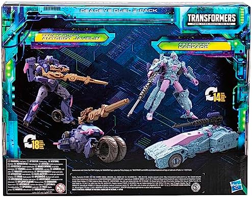 Product Description Experience the origin stories of legendary Cybertronians before the war with the Deadeye Duel 2-Pack! Before the Cybertronian War, Kaskade blasted Javelin in the head, cementing their long-standing rivalry in Transformers history. The Deadeye Duel 2-Pack comes with a Senate Guard Autobot Javelin action figure and a Ascenticon Kaskade action figure. Both Transformers action figures convert from robot to Cybertronian vehicle mode and come with 2 blaster accessories. This 2-Pack of Transformers toys features exclusive packaging pre-Cybertronian war artwork! Transformers and all related characters are trademarks of Hasbro. Key Features: DEADEYE DUEL 2-PACK: Face off in a feud between archenemies with these two Transformers collectible action figures This 2-Pack comes with Senate Guard Autobot Javelin and Ascenticon Kaskade toys for 8 year old boys and girls,INSPIRED BY IDW COMICS: This 2-pack is inspired by the IDW comics depicting the feud between the Senate Guard, Javelin, and the Ascenticon sharpshooter, Kaskade,2 EPIC MODES: Senate Guard Autobot Javelin Transformers action figure converts from robot to Cybertronian motorcycle mode in 18 steps Ascenticon Kaskade Transformers figure converts from robot to Cybertronian car mode in 14 steps,AWESOME ACCESSORIES: These Transformers toys for 8 year old boys and girls come with 2 blaster accessories Accessories attach to the figures in both modes,EXCLUSIVE PACKAGING ART: This 2-pack features a piece of exclusive pre-Cybertronian war-inspired artwork This product is designed with premium quality, ensuring durability and superior performance.