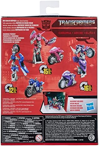 Product Description Reach past the big screen and build the ultimate Transformers collection with Studio series figures, inspired by iconic movie scenes and designed with specs and details to reflect the Transformers movie universe.in the Shanghai pursuit scene from Transformers: revenge of The fallen, arcee, Chromonica, and Elite are in hot pursuit of Deceptions.these Studio series 52 deluxe class arcee, Chromonica, and Elite figures features vivid, movie-inspired Deco and convert from robot to motorcycle mode in 15, 12, and 16 steps. Remove backdrop to showcase figures in the Shanghai pursuit scene. Includes 3 stands and 3 detailed accessories. Key Features: Studio series Deluxe class: deluxe class figures are 4.5-Inch collectible action figures inspired by iconic movie scenes and designed with specs and details to reflect the Transformers Movie universe.,4.5-Inch scale arcee, Chromonica, and Elite: figures are highly articulated, featuring vivid, movie-inspired deco, and include 3 stands and 3 detailed accessories.,Big screen inspired: figure scale reflects the characters' Sizes in the world of Transformers: revenge of The fallen Figures and packaging are inspired by the iconic Shanghai Pursuit scene.,2 iconic modes: figures convert between robot and motorcycle mode in 15, 12, and 16 steps Perfect for fans looking for a more advanced converting figure For kids and adults ages 8 and up.,Removable backdrop: fans can use the removable backdrop to pose and display the arcee, Chromonica, and Elite figures in the Shanghai Pursuit scene with their own style. This product is designed with premium quality, ensuring durability and superior performance.