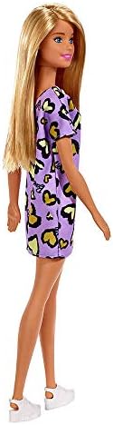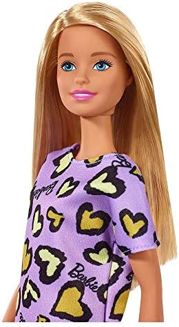 Product Description Barbie doll is easy to love wearing a t-shirt dress with a signature heart-print -a pair of white platform sneakers adds another trendy touch. Key Features: Barbie doll is ready for anything in a versatile purple dress that's right on trend with a signature heart print in shades of yellow!,White platform sneakers make a cool statement.,Her blonde hair is styled straight for a modern look.,Young fashionistas ages 3 to 7 years old will love the bright colors and trendy style.,Kids can tell all kinds of stories because when a girl plays with Barbie, she imagines everything she can become! This product is designed with premium quality, ensuring durability and superior performance.