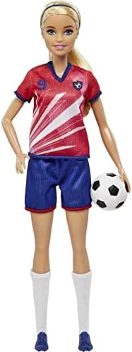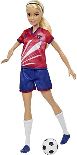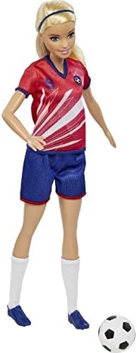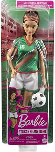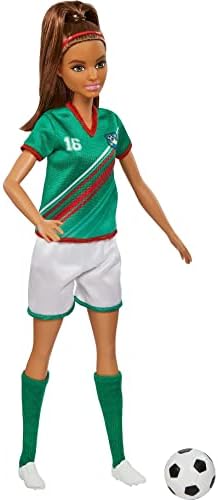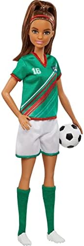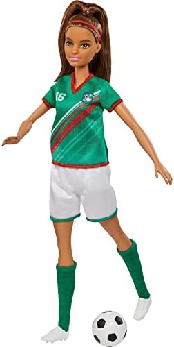 Product Description Get ready to celebrate one of kids' favorite sports with this Barbie soccer doll! Inspired by a globally popular color scheme, Barbie soccer doll (11.5 in) wears a uniform consisting of a green shirt with red stripes, the number '16' and a team patch plus white shorts, cleats and tall green socks. Barbie soccer doll also features a brunette ponytail and comes with a soccer ball accessory. Doll cannot stand alone. Colors and decorations may vary. Key Features: Celebrate one of kids' favorite sports with this Barbie soccer doll!,Barbie soccer doll (11.5 in) features a uniform inspired by a globally popular color scheme!,Ready to go for the goal, Barbie soccer doll sports a green shirt with red stripes, the number "16" and a team patch plus white shorts, cleats and tall green socks.,Barbie soccer doll also has a brunette ponytail and comes with a soccer ball accessory.,Makes a great gift for kids 3 years old and up, especially those interested in soccer, sports and fitness! This product is designed with premium quality, ensuring durability and superior performance.