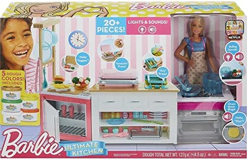 nan Key Features: A"Barbie doll helps young food lovers cook up fun with the Ultimate Kitchen playset featuring lights and sounds, food molds and 5 dough colors and more than 20 pieces for role-play and storytelling fun.,A"Multiple play areas feature an oven with pie mold, "fry press," "sandwich" maker and veggie mold.,A"Fill the pie mold with dough and press to see it rise; then place in the oven and lift the lever to hear the timer ding -- dessert is ready.,A"Fill the "fry press" with yellow dough and close the lid to form fries and hear a mouth-watering sizzle.,A"Fill the sandwich maker with dough and close; open to reveal sandwich layers that can be assembled to make one to order..A"Veggie lovers can fill the veggie mold with dough and close to shape tasty-looking ingredients to cook up on the stove or toss in a salad; there's a carrot, stalk of broccoli, 2 mushrooms and 2 tomato slices..A"Additional pieces -- more than 20 A" provide all of the ingredients for imaginative inspiration and all-day play. This product is designed with premium quality, ensuring durability and superior performance.