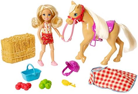 Product Description On Barbie farm, everyone can give a hand to make work easier and stories more fun! Children can imagine a day at the farm with this Chelsea and Son Pony set. They will love taking care of the pony. They can help Chelsea feed it, dressing it, cover it and of course assemble it. This adorable caramel pony is equipped with a saddle and harness with reins in hues of pink. The Chelsea doll is articulated at the knees to be comfortable in the saddle and can put her pink spray to safely climb. Key Features: There's always something to do on Barbie farm, like caring for horses - kids can help Chelsea take care of her pony with this Chelsea and Pony set.,It contains a Chelsea doll with her pony and accessories for feeding, dressing, assembling and covering.,Let the imagination of kids gallop - Chelsea doll can put on his bomb and ride on horses thanks to his casual riding outfit and articulated knees.,Children can imagine feeding the pony with the apple block and lettuce block, basket and straw boot.,After an intense day, it's time for the pony to put on his blanket and have sweet dreams!,Great gift idea for children aged 3 years old, especially if they love horses!,Collect all of the Barbie farm themed dolls and toys because with Barbie kids can be everything they want! This product is designed with premium quality, ensuring durability and superior performance.