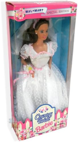 Product Description Barbie Country Bride Doll (Brunette) Wal Mart Special Edition (1994). Barbie is 11.5 inches tall and she has waist length dark brown hair and brown eyes. Her Wedding Gown has a white satin bodice with a scoop neckline. Around the neck, puffed sleeves, and over-skirt of this gown is white dotted tulle. At the ruffle around the neckline and sleeve ends is pink thread trim. Around her waist is a pink & white checked belt. The Bride wears a veil with a pink & white checked ribbon with a bow on top of her head. Key Features: Mattel 1994,Wal-Mart Exclusive,Brunette Edition,Barbie This product is designed with premium quality, ensuring durability and superior performance.