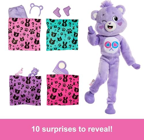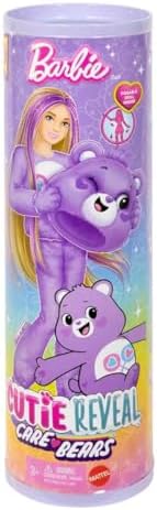 Product Description A"Barbie Cutie Reveal Care Bears dolls offer the cutest unboxing experience with 10 surprises! Discover one of three different Care Bears characters -- Cheer Bear, Share Bear or Grumpy Bear. Remove the adorable plush costume to reveal a posable Barbie doll. Which doll will you reveal? Then find more surprises like a skirt, headband, sunglasses, shoes, sponge-comb and matching mini Care Bear! Reverse the plush top for a fleece jacket and flip the costume head for a pet bed. Key Features: A"With 10 surprises in 1 package, Barbie Cutie Reveal Care Bears dolls deliver the cutest unboxing experience with plush friends, fashions and transforming fun!,A"Which doll will you reveal? Unbox to find fan-favorite Share Bear with purple plush costume featuring winking face and heart lollipop graphic -- so cute and lovable!,A"Lift the costume head and reveal a Barbie fashion doll with long, blonde hair streaked with purple, posable joints and twinkle-shine eye details!,A"Open the 4 surprise bags to find fashions and accessories like a skirt, headband, sunglasses, pair of shoes, sponge-comb and matching mini Share Bear!,A"Kids can dress and style Barbie doll by reversing the costume top to find a super-soft fleece jacket with a fun print -- the costume head turns into a bed for the mini Care Bears friend, too!,A"Use icy cold and warm water to transform Barbie doll's hair with color streaks and a new look -- repeat again and again!,A"This series of Barbie Cutie Reveal dolls makes a great gift for kids 3 to 7 years old, especially fans of the Care Bears and those who love spreading sharing, caring and togetherness! This product is designed with premium quality, ensuring durability and superior performance.