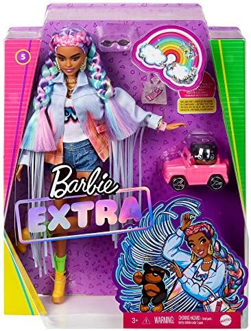 Product Description Barbie Extra dolls rock bold fashions and bright colors, and they make big statements! Each Barbie doll has their own unique style that's playful and over the top. And their pets -- each different and all adorable -- have tons of personality, too! Barbie Extra lets kids explore self-expression through style and offers an exciting fashion and styling play experience with posable dolls. They are all about having fun with fashion with glitter, gummy bears, emojis and stand-out hair -- bringing EXTRA vibes wherever they go. Each sold separately, subject to availability. Dolls cannot stand alone. Key Features: When it comes to fashion, Barbie Extra dolls have a 'more is more' attitude, featuring 15 pieces that include clothing and fashion accessories, as well as a pet and pet accessories.,Barbie doll's hairstyle goes big with rainbow-colored hair styled in 2 thick braids.,A fun and playful look showcases her confident style with a graphic tee and denim shorts with real pockets layered with a flame-print denim jacket with extra-long fringe on the arms.,Barbie doll's accessories -a cell phone purse, micro-sunglasses, jewelry, green socks and brown boots -add personal expression and unexpected moments of storytelling fun.,The puppy figure is oh-so-EXTRA, too, with a playful expression and a bright pink car of its own. This product is designed with premium quality, ensuring durability and superior performance.