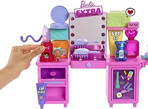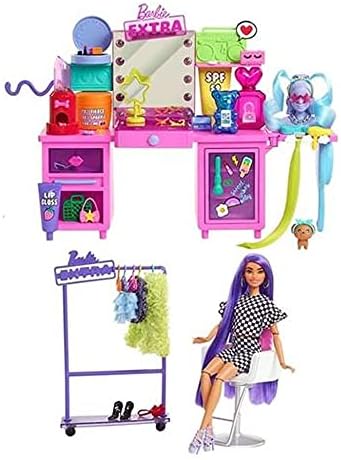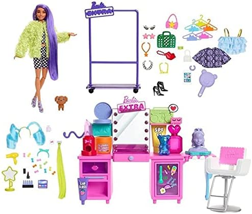 Product Description Pump up the style in this vanity-inspired playset with a working mirror and lights! It's the perfect space to bring EXTRA-ordinary looks to life. Tell endless fashion stories with more than 45 pieces -- an exclusive Barbie Extra doll, rolling clothing rack, fashions, accessories, hair extensions, adorable pup and more! After Barbie Extra doll is dressed and accessorized, check out her style in the vanity mirror, display fashions on the branded Barbie Extra hangers and rolling clothing rack or use the mannequin head for hair and accessory styling. Key Features: When it comes to fashion, Barbie Extra dolls have a "more is more" attitude, and this vanity set provides the perfect space to bring EXTRA-ordinary fashion looks to life!,The vanity playset comes with an exclusive Barbie Extra doll that's posable with extra-long purple hair and 45+ pieces that include a pet puppy, ice-cream sandwich salon chair, rolling clothing rack, branded hangers, hair extensions, clothing and so many accessories!,Designed in bright colors, the vanity has shelves and storage for accessories, plus a working mirror with bulbs that light up in pink when kids press down on the Barbie Extra logo!,A wheeled clothing rack really rolls and comes with Barbie Extra branded hangers for the included fashions -- neon fluffy coat, matching checkered top and bottom outfit, ruffled top, snake-skin print top -- so kids can create different looks.,Spin the vanity's mannequin head -- it rotates 360 degrees and holds hair and styling accessories, like colorful hair extensions, sunglasses and jewelry. This product is designed with premium quality, ensuring durability and superior performance.