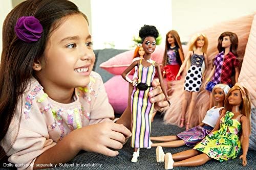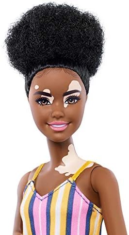 Product Description Barbie Fashionistas celebrate diversity with unique fashion dolls that encourage real-world storytelling and open-ended dreams. With a wide variety of skin tones, eye colors, hair colors and textures, body types and fashions, the Fashionistas dolls are designed to reflect the world girls see today, offering them infinite ways to play out stories and express their style. Includes Barbie Fashionistas doll wearing fashions and accessories. Each sold separately, subject to availability. Barbie dolls cannot stand alone. Flat shoes fit dolls with articulated ankles or flat feet. Key Features: The latest line of Barbie Fashionistas dolls includes 7 body types, 9 skin tones, 7 eye colors, 11 hair colors, 12 hairstyles and so many on-trend fashions and accessories!,Barbie doll has a more petite body than the original and has vitiligo areas on her face, neck and hands.,She wears a colorful striped dress with white sneakers and a fanny pack.,Her brunette hair is styled in curls atop her head for a look that's right on trend.,Makes a great gift for kids 3 years and older because when a girl plays with Barbie, she imagines everything she can become! This product is designed with premium quality, ensuring durability and superior performance.