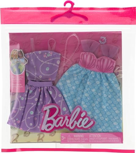 Product Description Dress Barbie doll for any situation with a wardrobe that can keep up! With doll clothes and accessories for two complete outfits in one fashion pack, these Barbie clothing sets offer double the styling fun (doll not included). Mix and match within the set and with other fashions in the line to create different looks and explore style. Universal fit designed to fit most Barbie dolls. Dolls and fashion packs each sold separately, subject to availability. Key Features: These 2-in-1 Barbie clothing sets offer double the fashion fun with doll clothes and accessories for two complete looks!,Barbie doll can live out her mermaid dreams with this clothing set that looks pulled straight from a magical undersea realm! Doll not included.,The dress has a shell-print bodice with tulle straps and a scaly skirt, while the lilac top and skirt set is printed with strands of pearls.,A statement seahorse and starfish necklace, along with a pearly blue bracelet, complement both outfits beautifully.,The versatile clothing fits most Barbie body types, and features fabrics made from recycled plastics -- excluding the trim.,Kids can collect different fashion packs to expand Barbie doll's wardrobe and inspire stories at playtime! Each sold separately, subject to availability. This product is designed with premium quality, ensuring durability and superior performance.