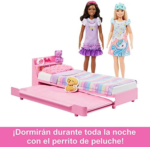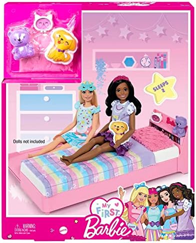 Product Description My First Barbie is a debut collection for preschoolers! Its bedtime playset features a pastel pink trundle bed that fits two My First Barbie dolls. A soft pillow, blanket and plush puppy piece add comfort, while large-scale accessories like a teddy bear and clock set the scene for sweet storytelling and slumber party fun! Barbie dolls not included. Key Features: Welcome to the charming world of My First Barbie, where preschoolers play, learn and grow with dolls and playsets.,Cozy and colorful, the My First Barbie trundle bedtime playset inspires sweet dreams and nurturing, imaginative play.,The bed sleeps two 13.5-inch My First Barbie dolls (not included) Stow away the additional mattress or slide it out when a friend comes over for a slumber party.,A furry pillow, soft blanket and puppy plush add comfy touches Kids will want to snuggle their doll under the covers and tell her magical stories, encouraging qualities like tenderness and care.,Other storytelling accessories include a teddy bear and alarm clock Their larger My First Barbie scale makes them age-appropriate and easy to handle.,From reading with loved ones to giggling at slumber parties, this playset encourages fun, relatable storytelling for young kids.,The My First Barbie collection is perfect for little kids and preschoolers Check out the whole line of dolls and playsets for adorable gift ideas that inspire nurturing play. This product is designed with premium quality, ensuring durability and superior performance.