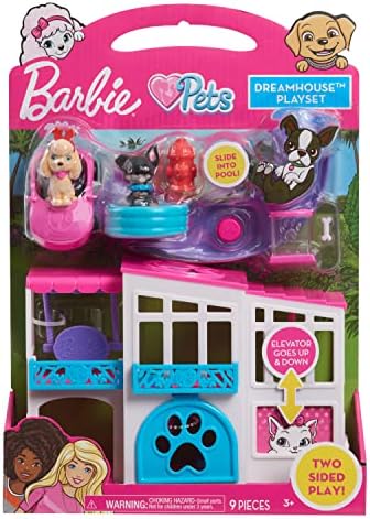 Product Description Now you can make your pocket-sized puppies right at home with the Barbie Pet Dreamhouse Playset! The Pet Dreamhouse Playset is beyond what any pet could dream of and includes ample accessories. The house is perfect for two-sided play and features a slide, a swing, and a working elevator to get pets from the first to second floor. The set also includes two puppies, one food dispenser with one bone, one frisbee, one hydrant, one pet convertible, and one pool. Key Features: Set includes: two puppies, one dreamhouse one food dispenser with a bone, one frisbee, one hydrant, one pet convertible, and one pool.,Each pet stands 1A tall,Perfect for both play and display!,Ages 3+ This product is designed with premium quality, ensuring durability and superior performance.