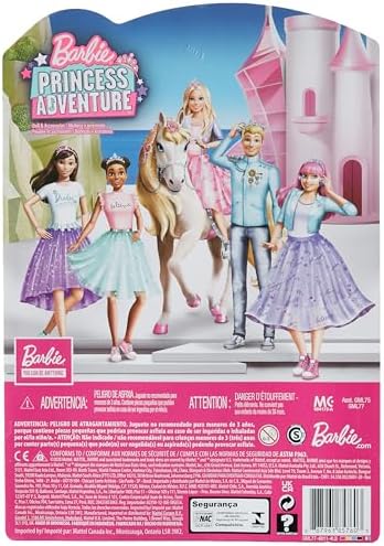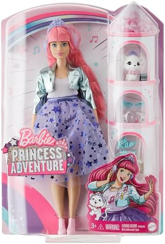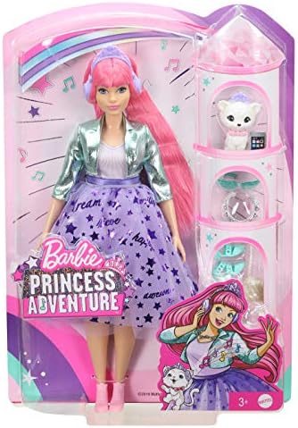 Product Description Barbie dolls inspired by Barbie Princess Adventure transport young dreamers to a faraway land where imagination reigns -and no Barbie adventure would be complete without her best friend Daisy! Daisy doll is royally trendy in a purple top and full skirt with sweet, sparkly graphics reading, "believe," "happy," "dream," and more. A cropped metallic jacket helps her shine, and pink high-tops add another bright pop of color. Key Features: Barbie dolls inspired by Barbie Princess Adventure transport young dreamers to a faraway land where imagination reigns!,Daisy doll puts a trendy twist on her princess look in a full skirt with sparkly graphics, a metallic jacket, pink high-tops and a tiara with built-in headphones.,Stylish accessories include a pair of pointed-toe flats, "pearl"-detailed purse, cat-eye sunglasses, necklace and smart phone.,Daisy doll's pet kitten is royally cute in her own tiara and bow-detailed collar!,Imaginations aged 3 to 7 years old will love dreaming up their own royal adventures because when a girl plays with Barbie, she imagines everything she can become!,Kids can collect more Barbie Princess Adventure dolls and toys to play out tales with the entire kingdom. This product is designed with premium quality, ensuring durability and superior performance.
