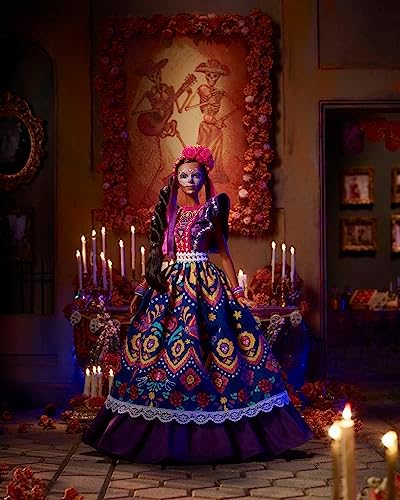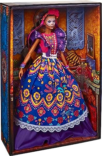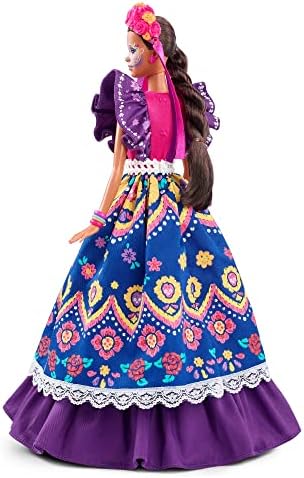 Product Description The Barbie DAa De Muertos series honors the customs, symbols and rituals often seen throughout the festive time of remembrance. Barbie celebrates the time-honored holiday with 2022 DAa De Muertos Barbie doll wearing a ruffled dress in a rich royal purple, with pigment-print skeletons, calavera sugar skulls and flower details. Her bone belt is the perfect finishing touch. Crowning her head is a vibrant cempasAchil flower and rose headband with streaming ribbons. In gorgeous packaging featuring an original illustration, this collectible doll is ideal for display and gifting. Key Features: Barbie celebrates DAa De Muertos 2022 with a collectible doll honoring the traditions, symbols and rituals of the time-honored holiday.,Barbie doll wears a ruffled dress in a rich royal purple, with pigment-print skeletons, calavera sugar skulls and flower details.,Her hair is pulled back to highlight striking calavera face painting.,A vibrant cempasAchil flower and rose headband with streaming ribbons completes Barbie doll's gorgeous look.,In beautiful packaging featuring an original illustration, this collectible Barbie doll is ideal for display and gifting.,May 2022 Barbie DAa De Muertos doll become a treasured tradition for your celebration Includes doll stand and Certificate of Authenticity. This product is designed with premium quality, ensuring durability and superior performance.
