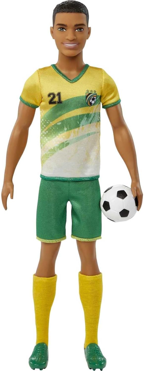 Barbie Careers Ken Soccer Player Doll " #21 Uniform, Cropped Hair, Cleats, Socks & Soccer Ball Soccer-Ready Look: Ken soccer doll (11.5 inches) wears a yellow shirt with a green stripe, the number "21," a team patch, green shorts, tall yellow socks, and cleats. Active Appearance: Features short cropped hair and comes with a soccer ball accessory for added play value. Great Gift for Sports Fans: Ideal for kids ages 3 and up who love soccer and sports. Inspires Imagination: Perfect for creative play, bringing soccer fun to life!