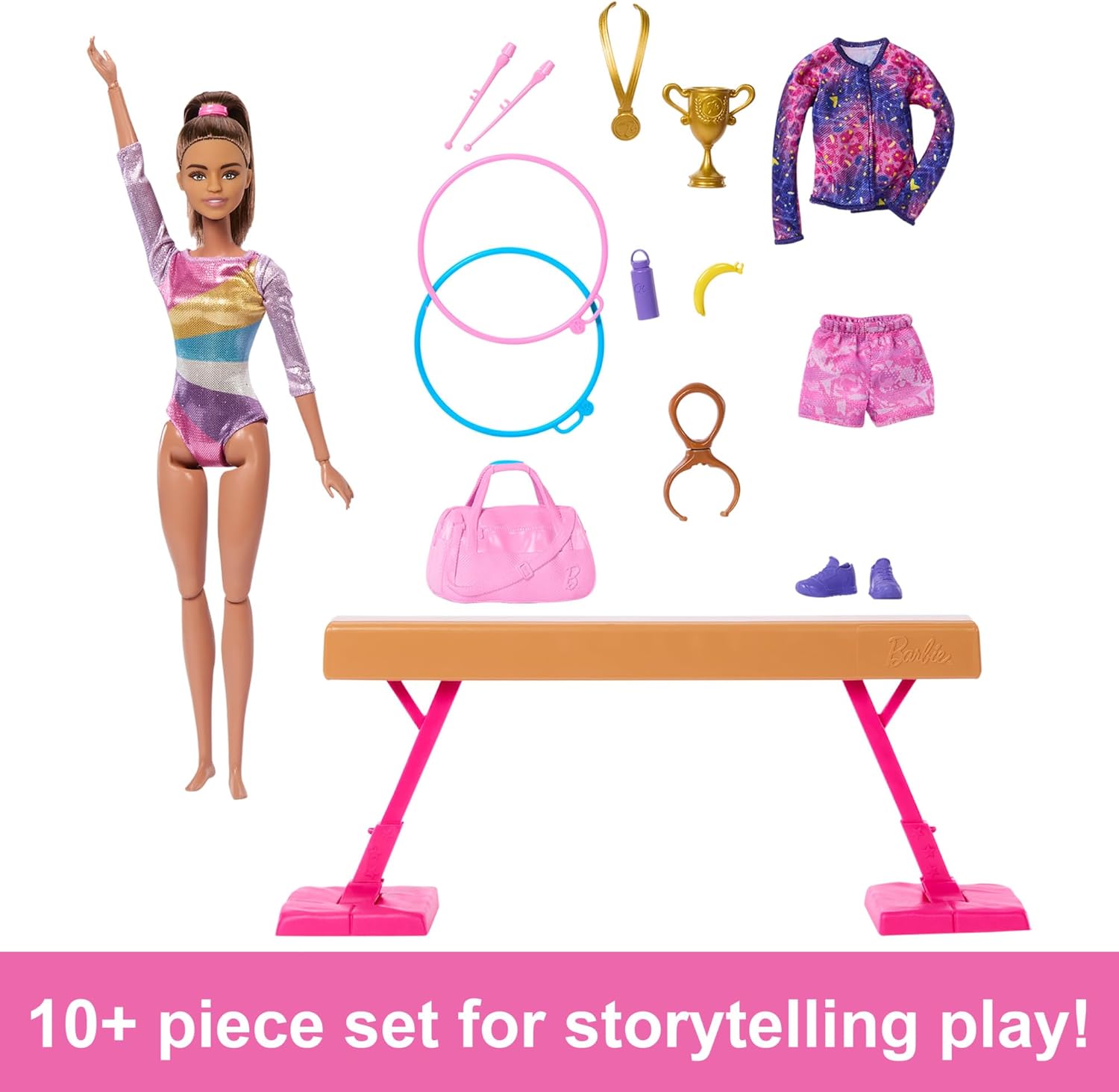 Barbie Gymnastics Playset " Brunette Doll with Flipping Action, Balance Beam & AccessoriesGet ready for some high-flying gymnastics fun with the Barbie Gymnastics Playset! Flipping action: Snap Barbie doll's waist into the c-clip to help her perform flips, cartwheels, and leaps 10+ accessories: Includes a balance beam, trophy, medal, water bottle, snack, and more Gymnast gear: Barbie wears a colorful iridescent leotard with a ponytail, plus a warm-up suit, sneakers, and gym bag Perfect for inspiring imaginative routines and competition stories, this set is a must-have for young gymnasts and Barbie fans!