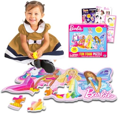 Product Description Barbie Floor Puzzle for Girls - Bundle with 28 Pc Barbie and Friends Foam Puzzle Plus Stickers, More | Barbie Toys and Games for Toddlers, Kids. This Barbie floor puzzle contains 28 durable foam pieces and when complete, the puzzle measures 24 in x 13 in and depicts colorful cartoon artwork of Barbie and her friends! Sure to be a hit with all Barbie, this floor puzzle is great to use as an activity at your next Barbie themed party, or great to use as a gift for the Barbie fan in your life. Key Features: Barbie Floor Puzzle for Girls - Bundle with 28 Pc Barbie and Friends Foam Puzzle Plus Stickers, More | Barbie Toys and Games for Toddlers, Kids.,This Barbie floor puzzle contains 28 durable foam pieces and when complete, the puzzle measures 24 in x 13 in and depicts colorful cartoon artwork of Barbie and her friends!,Sure to be a hit with all Barbie, this floor puzzle is great to use as an activity at your next Barbie themed party, or great to use as a gift for the Barbie fan in your life.,Have hours of fun rebuilding this puzzle over and over! Kids are sure to have a great time building this Barbie and friends puzzle alone or with friends and family!,Officially licensed Barbie and friends puzzle for all kids, boys and girls alike Set also includes Barbie stickers, Luna and the Cloud Elves stickers, and a Beach Kids princess castle door hanger. This product is designed with premium quality, ensuring durability and superior performance.