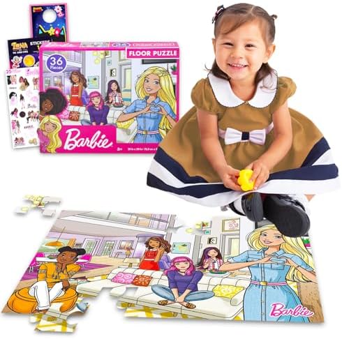 Product Description Barbie Floor Puzzle for Girls - Bundle with 36 Pc Barbie and Friends Floor Puzzle Plus Stickers, More | Barbie Toys and Games for Toddlers, Kids. This Barbie floor puzzle contains 36 pieces and measures 20 in x 30 in when complete. Key Features: Barbie Floor Puzzle for Girls - Bundle with 36 Pc Barbie and Friends Floor Puzzle Plus Stickers, More | Barbie Toys and Games for Toddlers, Kids.,This Barbie floor puzzle contains 36 pieces and measures 20 in x 30 in when complete Barbie floor puzzle depicts colorful cartoon artwork of Barbie and her friends!,Sure to be a hit with all Barbie fans, this floor puzzle is great to use as an activity at your next Barbie themed party, or great to use as a gift for the Barbie fan in your life!,Have hours of fun rebuilding this puzzle over and over! Kids of all ages are sure to have a great time building this Barbie and friends puzzle alone or with friends and family!,Officially licensed Barbie and friends puzzle for all kids, boys and girls alike Set also includes Barbie stickers, Luna and the Cloud Elves stickers, and a Beach Kids cat door hanger. This product is designed with premium quality, ensuring durability and superior performance.