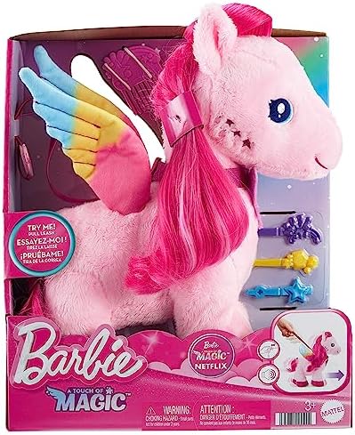 Product Description Playtime just got more enchanting with the Barbie Walk & Flutter Pegasus! This adorably pink plush can walk all by herself and flap her colorful wings at the same time! She also comes with a musical sound feature, as well as a hair comb and three barrettes for her mane. Kids can play out their favorite scenes from Barbie A Touch of Magic, or come up with fantastical adventures of their own! 3 x AAA batteries included. Key Features: Dream up fairytales with a magical Barbie plush! At 11-inches-tall, the Walk & Flutter Pegasus brings the wonder of Barbie A Touch of Magic to the home.,Cute as can be, the pink Barbie pegasus has a self-walking feature that also activates her wings Just pull on her leash to watch her legs move and wings flutter!,To heighten the magic even more, the plush sings the enchanting Barbie A Touch of Magic song while she walks!,Brush her long mane and tail with the included comb, and then get creative and accessorize with three colorful barrettes.,Soft and sweet as can be, the Barbie Walk AN Flutter Pegasus makes a charming toy for kids who are 3 years old and up! This product is designed with premium quality, ensuring durability and superior performance.