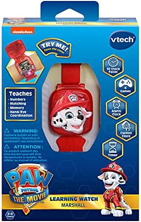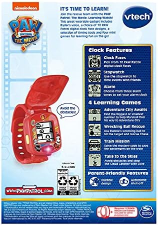 Product Description Time flies when your child is on a roll with the PAW Patrol - The Movie: Learning Watch featuring Chase on the cover! The voice of Ryder guides children through play. Games and activities help children learn basic math skills, number sequences, matching, memory and hand/eye coordination. Pick from ten PAW Patrol digital clock face designs and three alarm tones, then use the stopwatch to time events with friends. ItaTMs game time! Explore four learning games with the PAW Patrol pups. Key Features: Chase Learning Watch features characters and adventures from PAW Patrol: The Movie,Digital watch includes ten PAW Patrol clock faces, three alarm tones and a stopwatch,Four learning games reinforce basic math skills, number sequencing, matching, memory and hand/eye coordination with adventure games based on the movie,Learn and play with the voice of Ryder, games with Marshall, Rubble, Chase and Skye, and the face of Chase on your wristwatch,Intended for ages 3a6 years; requires 1 CR2450 lithium coin battery; battery included for demo purposes only; new battery recommended for regular use This product is designed with premium quality, ensuring durability and superior performance.
