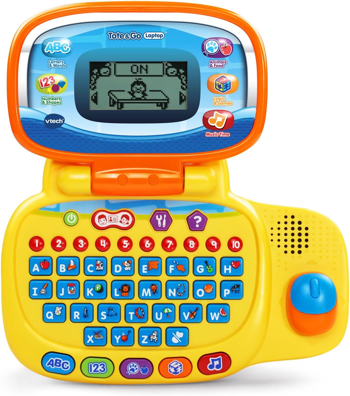 VTech Tote and Go Laptop A" Yellow Interactive Learning Toy for Toddlers 20 Learning Activities: Teaches over 60 words, spelling, shapes, logic, animals, and more with progressive difficulty levels. Music Fun: Plays 30 popular melodies in rock, country, and jazz styles to keep kids entertained. Personalization: Customize with your childAs name, age, favorite food, avatar, and more for a fun, personalized experience. Mouse Skills: Includes an attached mouse to introduce basic mouse skills and improve hand-eye coordination. Engaging Education: Activities cover spelling, math, animals, logic, and music to boost early learning and cognitive skills. Portable Learning: Perfect for on-the-go learning with a portable design that encourages fun and development. Ideal for toddlers, this interactive laptop combines education and entertainment while keeping young minds engaged.