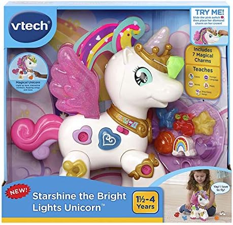 Product Description Go on an enchanted adventure with Starshine the bright lights unicorn. Place the seven charms on any of the three magic hearts to see her horn light up and hear colors, objects and phrases in English or Spanish. Use the charms to answer quiz questions or add sound effects to create your own special song. Squeeze the Unicorn's tail to see her beautiful wings flap and hear whimsical phrases and sound effects that encourage imaginative play. Key Features: Choose from seven charms in the heart-shaped dish and place them on the three magic hearts to hear colors, objects and phrases in English and Spanish,Starshine's horn lights up in a rainbow of colors Press the Blue heart button to hear quiz questions, then place the charms on the unicorn to answer them,In music mode, press the Blue heart button to choose a melody, then place the charms on her to add sound effects and create your own special song,Squeeze the magical unicorn's tail to see her beautiful wings flap and hear whimsical phrases and sound effects that encourage imaginative play,Starshine unicorn toy requires 2 A (batteries included for demo purposes only; new batteries recommended for regular use); intended for ages 18 months to 4 years This product is designed with premium quality, ensuring durability and superior performance.