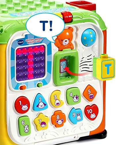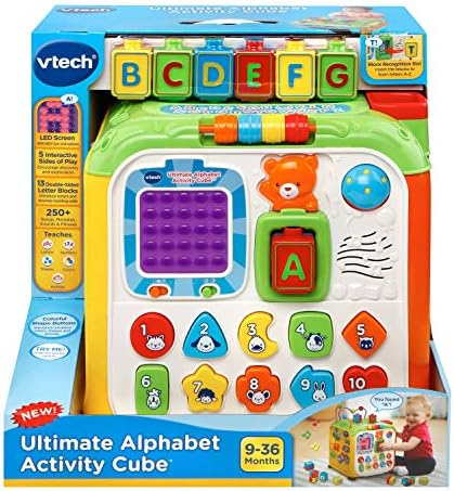 Product Description Get the building blocks of learning with the alphabet activity cube by Vetch. This five-sided learning cube includes 13 double-sided letter blocks and provides a variety of developmental benefits for years of play. Insert the blocks into the block recognition slot and the cube will show the letter on the LED screen and introduce it through a playful song. Drop the letter blocks into the chute and each block will be counted or will play sounds as it drops down the peg maze. Key Features: This five-sided learning cube includes 13 double-sided letter blocks and provides a variety of developmental benefits for years of play,Insert the blocks into the block recognition slot and the cube will show the letter on the LED screen and introduce it through a playful song,Drop the letter blocks into the chute and each block will be counted or will play sounds as it drops down the peg maze,Press the 10 colorful shape buttons to learn about numbers, colors, shapes, animal names and sounds and simple questions that will keep toddlers engaged,Requires 2 A battery (battery included for demo purposes only; new battery recommended for regular use); intended for ages 9 months to 3 years This product is designed with premium quality, ensuring durability and superior performance.