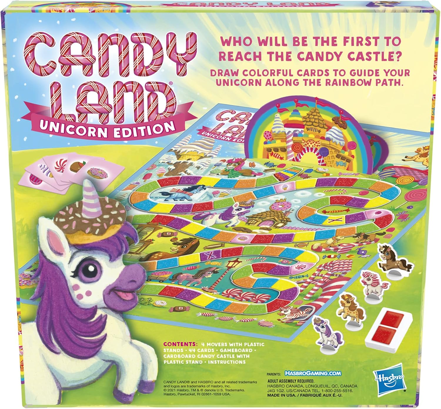 Hasbro Gaming Candy Land Unicorn Edition " Magical Preschool Board Game A classic game with a magical unicorn twist! The Candy Land Unicorn Edition takes kids on an enchanting journey along the rainbow path to Rainbow Mountain. With simple gameplay and no reading required, it's perfect for preschoolers and first-time players. Why Kids Will Love It: A Magical Adventure " Travel through a colorful, unicorn-themed Candy Land. Easy for Little Ones " Draw cards to move, no reading required. Fun & Nostalgic " A fresh take on the beloved classic game. Encourages Learning " Helps kids develop color recognition and turn-taking skills. Perfect for kids ages 3 and up, this whimsical Unicorn Edition of Candy Land is a delightful way to introduce young players to board games. Let the adventure begin!