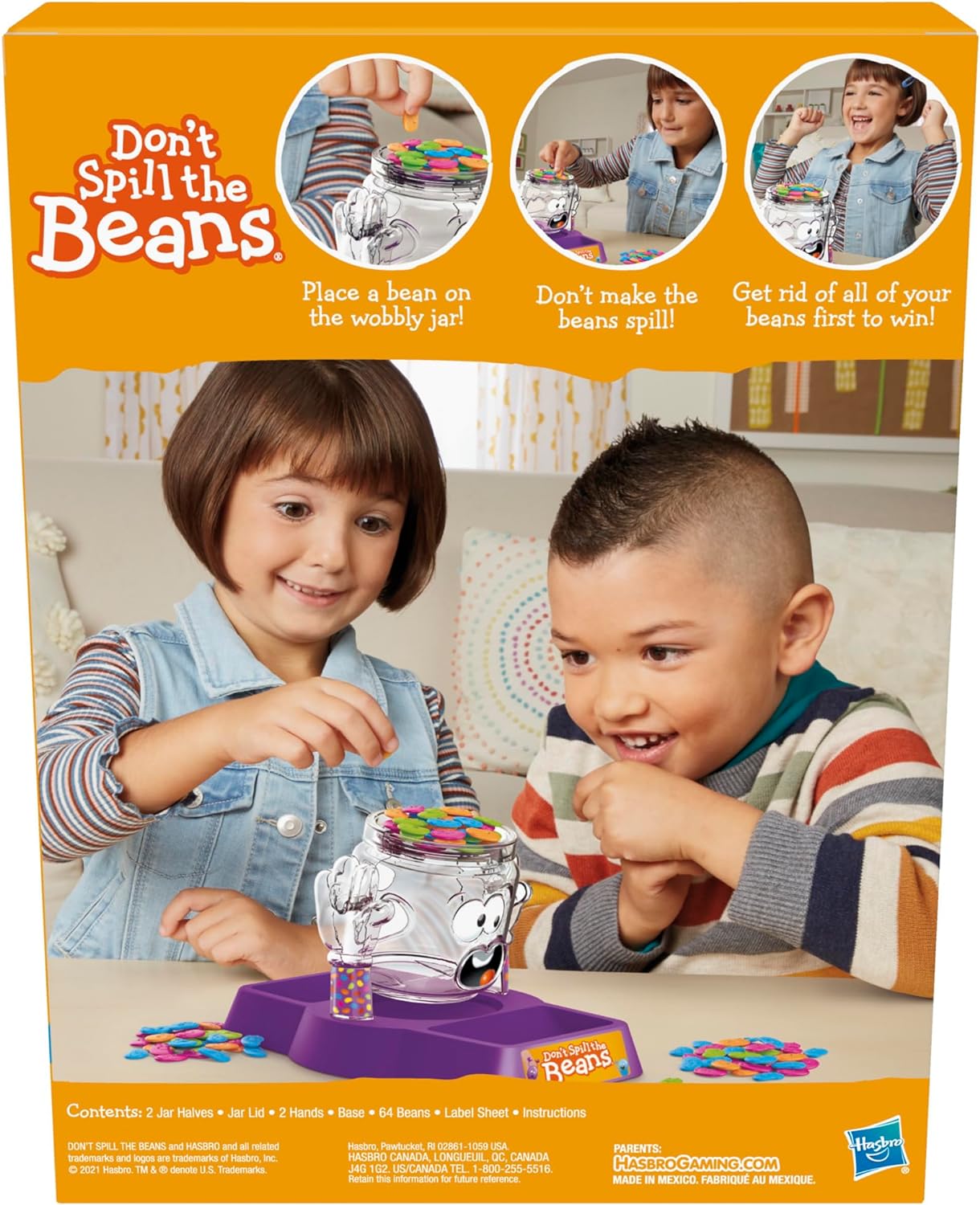 Hasbro Gaming Don't Spill the Beans " Fun Balancing Game Balance, stack, and don't let the jar tip! Don't Spill the Beans is the classic suspense-filled game where players take turns carefully placing beans into a wobbly plastic jar"but be careful! If the jar tips, you'll have to collect all the spilled beans! Why Kids Will Love It: Easy & Fun for Preschoolers " No reading required, perfect for kids ages 3 and up. Exciting & Suspenseful " The more beans added, the shakier the jar gets! Colorful & Engaging " Comes with 60+ plastic beans and stickers to customize the jar with a silly face. Great for Playdates & Family Game Nights " A simple 2-player game filled with laughter. A fun, interactive game that helps with hand-eye coordination and patience, Don't Spill the Beans is a fantastic gift for little ones and a must-have for game night!