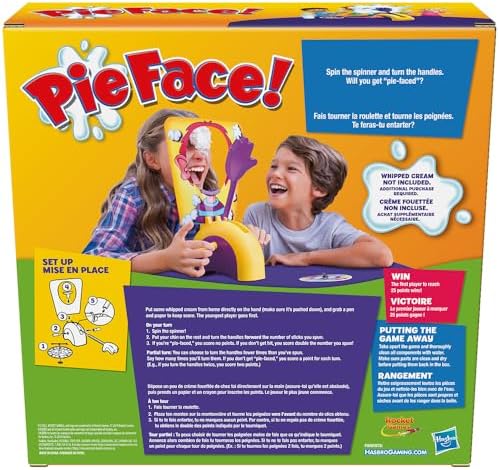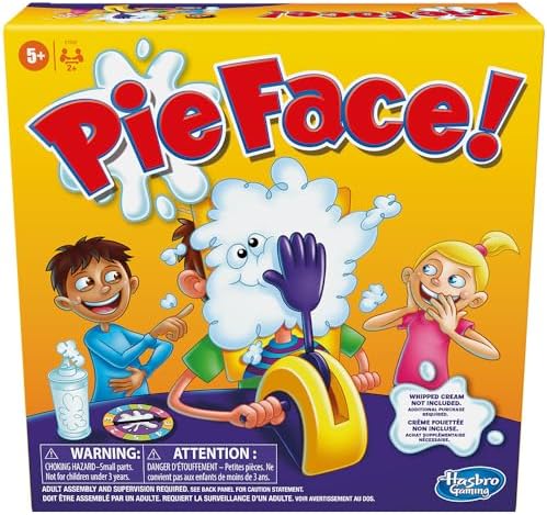 nan Key Features: 100% Plastic,Imported,Recommended for ages 5 years and up,2 or more player game; Whipped cream NOT included,Includes: 1 pie thrower, 1 throwing arm, 2 handles, 1 chin rest, 1 splash card mask, spinner and sponge,Pie Face game is filled with fun and suspense,You score a point for every time you turn the handle without getting pie-faced, and the one who scores 25 points wins This product is designed with premium quality, ensuring durability and superior performance.