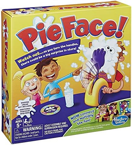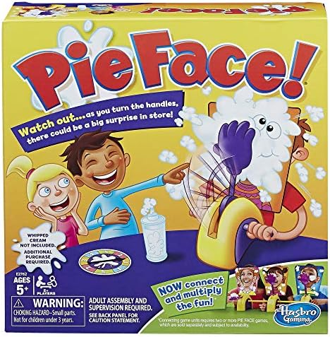 Product Description The simple Pie Face game brings friends and family together for lots of laugh-out-loud fun. First, players load the arm with whipped cream (not included, additional purchase necessary). Then, players take turns sliding their heads through the face mask and spinning the spinner. Players turn the handle the number of times indicated on the spinner and the tension on the arm builds. Key Features: Pie-throwing arm could go off at any moment,Players score points every time they avoid getting whipped cream in the face,First player to score 25 points wins,Play Chain Reaction Mode by connecting multiple games (each game sold separately),Includes pie thrower, throwing arm, 2 handles, chin rest, double-sided splash-card mask, spinner, game connector, and instructions.,Ages 5 nd up This product is designed with premium quality, ensuring durability and superior performance.