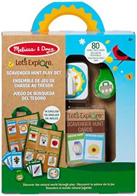 Product Description Explore the outdoors and more while discovering the thrill of the classic seek-and-find game with the Melissa & Doug LetaTMs Explorea Indoor/Outdoor Scavenger Hunt Play Set! Explore the yard, the park, the playground, and more with the Outdoor version, or hunt for everyday items right at home with the Indoor cards. Choose from 80 double-sided cards, grab one of two jumbo collection totes, set the 10-minute timer, then ready, set, explore! The play set also includes two reusable ID tags for the totes, and a collectible medallion. Key Features: A scavenger hunt game with cards listing 160 items to find both indoors and outdoors,Includes 80 double-sided item cards, 2 jumbo totes with see-through pockets to display cards, lots of room for collected items, and reusable ID tags, 10-minute timer, collectible medallion,Cards with 160 fun things to find include game instructions and variations,LetaTMs Explore by Melissa & Doug encourages kids to connect with the natural world through imaginative play, and to discover the joy of outdoor adventures that instill curiosity and confidence while inspiring them to say, aLetaTMs Explorea,Makes a great gift for ages 4- to 8-year-olds, for hands-on, screen-free play This product is designed with premium quality, ensuring durability and superior performance.