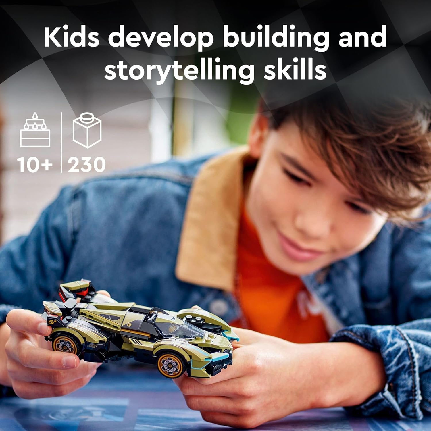LEGO Speed Champions Lamborghini V12 Vision GT " Buildable F1 Supercar Toy Iconic Lamborghini Supercar: Recreate the sleek and futuristic Lamborghini V12 Vision GT, a must-have for kids 10+ and supercar enthusiasts. Driver Minifigure Included: Features a driver minifigure dressed in a Gran Turismo outfit with a racing helmet, ready for high-speed action. Authentic Details: Includes signature design elements like the cockpit, split rear wing, hexagonal wheels, dual tailpipes, Gran Turismo branding, and iconic Y-shaped taillights. Play & Display: Engage in hours of imaginative racing or showcase this Lamborghini model as a stylish display piece. Perfect Gift for Car Lovers: A great choice for kids, gamers, and adult collectors who appreciate innovative car design and Formula 1-inspired builds. Dimensions: This 230-piece set measures over 1.5" (3 cm) high, 6" (16 cm) long, and 2.5" (7 cm) wide"compact yet packed with detail. Get ready for an exhilarating build-and-race experience with this Lamborghini V12 Vision GT, blending speed, style, and creativity!
