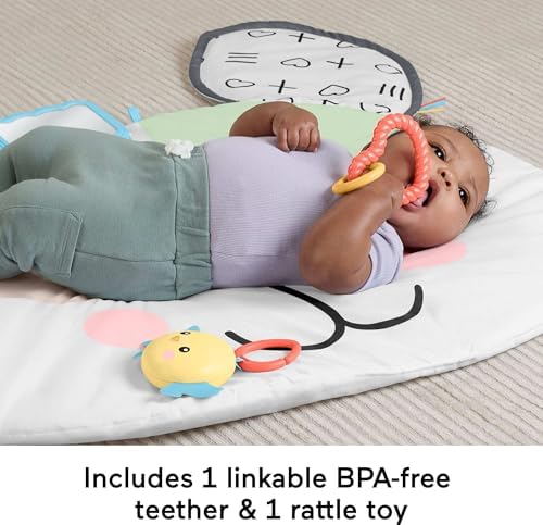 Product Description Tummy time is tail-wagging fun for your baby with the Puppy Perfection Giant Play Mat from Fisher-Price. This extra-large baby activity mat offers lots of space and exciting sensory details for newborns to explore as they grow from lay & play to tummy time and beyond. Designed with a friendly puppy face, high-contrast colors and a crinkle ear, this playmat comes with a prop-up self-discovery mirror and 2 linkable toys for little ones to rattle and teethe. Key Features: A"Extra-large, puppy-themed newborn activity mat with sensory details that grows with baby from lay & play to tummy time,A"Playmat features a prop-up self-discovery mirror, high-contrast colors and a crinkle ear for engaging sensory play,Includes 1 baby rattle & 1 BPA-free teether with convenient links,A"Soft play mat is machine washable with toys removed,A"Helps strengthen neck & core muscles and fosters gross motor skills and sensory development for newborn babies from birth and up This product is designed with premium quality, ensuring durability and superior performance.