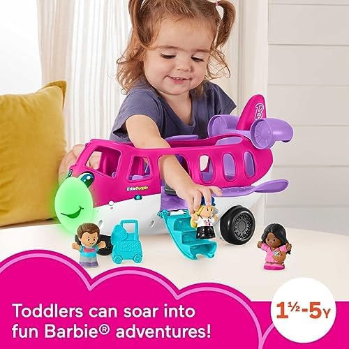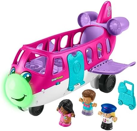 Product Description Kids can take off to imaginary adventures with Barbie's Little Dream Plane, presented by Little People. This push toy lights up and produces fun music, sounds and expressions when pressed on his nose, to stimulate your little one's imagination. Kids can set up all three figures on board the plane, pack away luggage, serve drinks with the trolley and fly the crew and passengers to great Barbie adventures. Key Features: The Barbie Dream Plane makes its debut into the world of Little People with its lights, sounds and fun expressions to boost role play in toddlers (18 months to 5 years),Press the captain's seat or open the door to light the nose of the plane, which produces fun expressions, sounds and music Press the globe button to choose language: English, German, French,The door opens and unveils the staircase allowing passengers to board it Features seven seats for adventure with Little People figures (Additional figures sold separately Some products may not be marketed.),Who wants to drink something? Children can run the beverage trolley in the aircraft aisle to serve passengers.,Set includes 1 airplane, 1 Barbie figure, 1 Ken figure, 1 pilot figure and 1 luggage element This product is designed with premium quality, ensuring durability and superior performance.