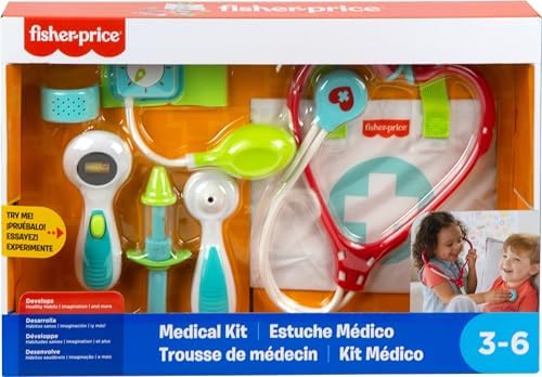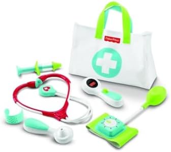 Product Description With the Fisher-Price Medical Kit, preschool kids can AtreatA and Acare forA patients with endless doctor role-play! This playset features 7 medical-themed play pieces for mini-MDs to use, including a stethoscope to 'listen' to their patient's heart, thermometer to 'check' their temperature, an otoscope to take a peek inside their ears, and a blood pressure cuff with a spinning gauge. Key Features: Pretend doctor playset with 7 medical tool play pieces, including stethoscope, blood pressure cuff, thermometer, otoscope, syringe, bandage & fabric 'doctor' bag,Press button on thermometer to go from AsickA to AwellA,Pump the blood pressure cuff to see the gauge spin,All play pieces store inside the bag, so making Ahouse callsA is a breeze,Encourages imaginative pretend play and healthy habits for preschool kids ages 3 years and older,Smilestones: Bringing a smile to milestones! This toy helps foster Kindness by encouraging kids to help others and have empathy for their ApatientsA This product is designed with premium quality, ensuring durability and superior performance.