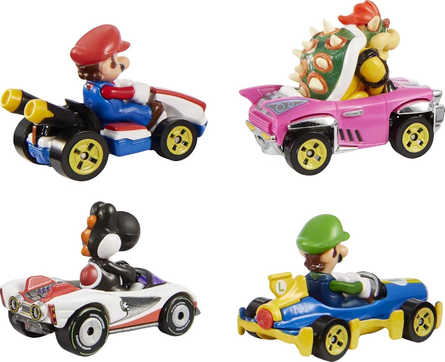 Hot Wheels Mario Kart 4-Pack " Die-Cast Toy Cars with Characters & Karts Die-Cast Racing Action: This 4-pack features 1:64 scale die-cast replicas of Mario Kart characters and their karts, including Mario, Luigi, Bowser, and an exclusive Black Yoshi. Track-Optimized: These karts are designed for performance on Hot Wheels tracks, allowing kids to recreate exciting racing moments from the Mario Kart video games. Perfect for Fans: A great gift for Mario Kart enthusiasts, this set is ideal for kids aged 3 and up, sparking imagination and racing fun. Exclusive Collectible: The Black Yoshi adds a rare and collectible element to the pack, perfect for both play and display. Fans of Mario Kart and Hot Wheels will enjoy the fast-paced fun of these iconic, track-ready vehicles!