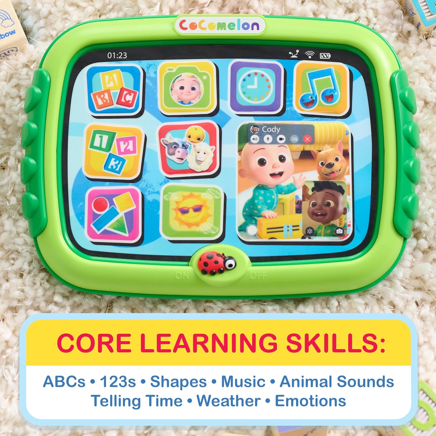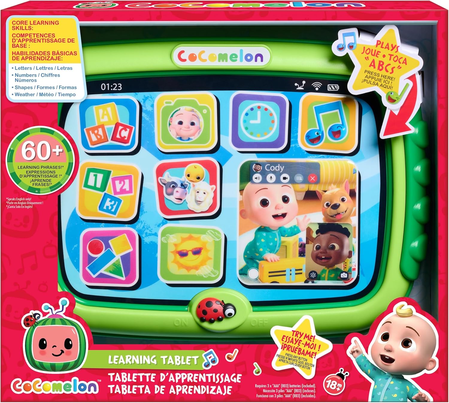 Just Play CoComelon Learning Tablet " 60+ Phrases & Alphabet Song for Ages 18 Months+ Engage little learners with the CoComelon Learning Tablet, an interactive toy inspired by the beloved CoComelon series! Fun Learning Adventures: With 9 colorful "app" buttons, 60+ phrases, and music, this toy teaches letters, numbers, shapes, animals, emotions, weather, and more. Interactive Play: Kids press icons to hear sounds and phrases, fostering fine motor skills, cognitive development, and creative pretend play. Sing Along with JJ: Press the music note button to hear "The Alphabet Song""a favorite sing-along tune for preschoolers. Toddler-Friendly Design: Easy-to-push buttons and a chunky build make it perfect for little hands. Portable Entertainment: At 9.2 x 7.1 inches, it's the ideal size for on-the-go learning during car rides and playdates. Perfect for toddlers aged 18 months and up, this educational tablet sparks curiosity and early learning through play. Batteries included for immediate fun!