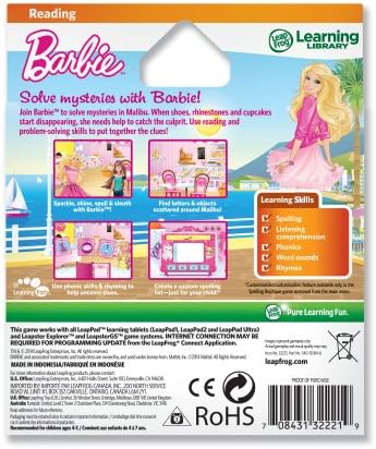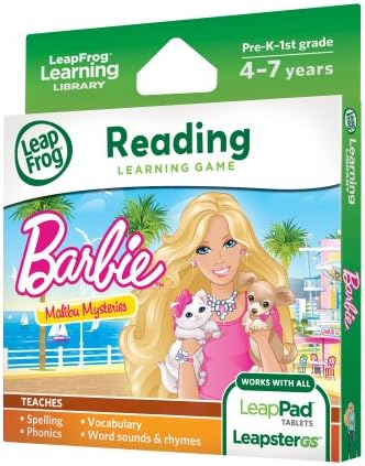 Product Description Product Description LeapFrog learning game: Barbie Malibu mysteries From the Manufacturer Join Barbie and her friends as they uncover clues and solve 3 different mysteries in Malibu using reading skills!. Key Features: Use reading and problem-solving skills to help Barbie catch a culprit who's been stealing shoes, shiny sparkly items and cupcakes all over Malibu,Create a custom spelling list-just for your child! Then spell words to power the glitter-rific silk screen machine,Teaches spelling, listening and reading comprehension, phonics, word sounds and rhymes,Ages 4-7 years,Works with all LeapPad learning tablets, LeapsterGS & Leapster Explorer (sold separately) This product is designed with premium quality, ensuring durability and superior performance.