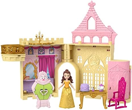 Product Description Fans will be delighted with this castle playset, inspired by Disney's Beauty and the Beast! A doll house in charming small scale, the castle opens to reveal multiple play areas, plus a Belle doll, 4 friends, furniture and more. Playset includes a handle for on-the-go play and can connect with other Storytime Stackers to expand the kingdom. Dolls cannot stand alone. Key Features: Inspired by the Disney animated classic Beauty and the Beast, the castle playset allows kids to recreate favorite scenes in the memorable location!,Playset opens to reveal a doll house with multiple play areas kids will recognize from the movie.,Rooms include Belle's bedroom with a fold-down bed, the dining room with spinning tabletop, and a hidden bathroom with bubble bath.,Also includes 4 fan-favorite friend figures: Mrs Potts the teapot, Chip the teacup, Lumiere, and the Wardrobe with doors that open.,Belle small doll appears in her classic yellow fashion with a removable soft skirt and is posable at the arms, legs and neck.,Playset includes a handle for a convenient travel toy Multiple playsets can also be stacked on top of each other or connected side by side.,Fans can collect all the Disney Princess stacking playsets and build the ultimate kingdom! Each set sold separately, subject to availability. This product is designed with premium quality, ensuring durability and superior performance.