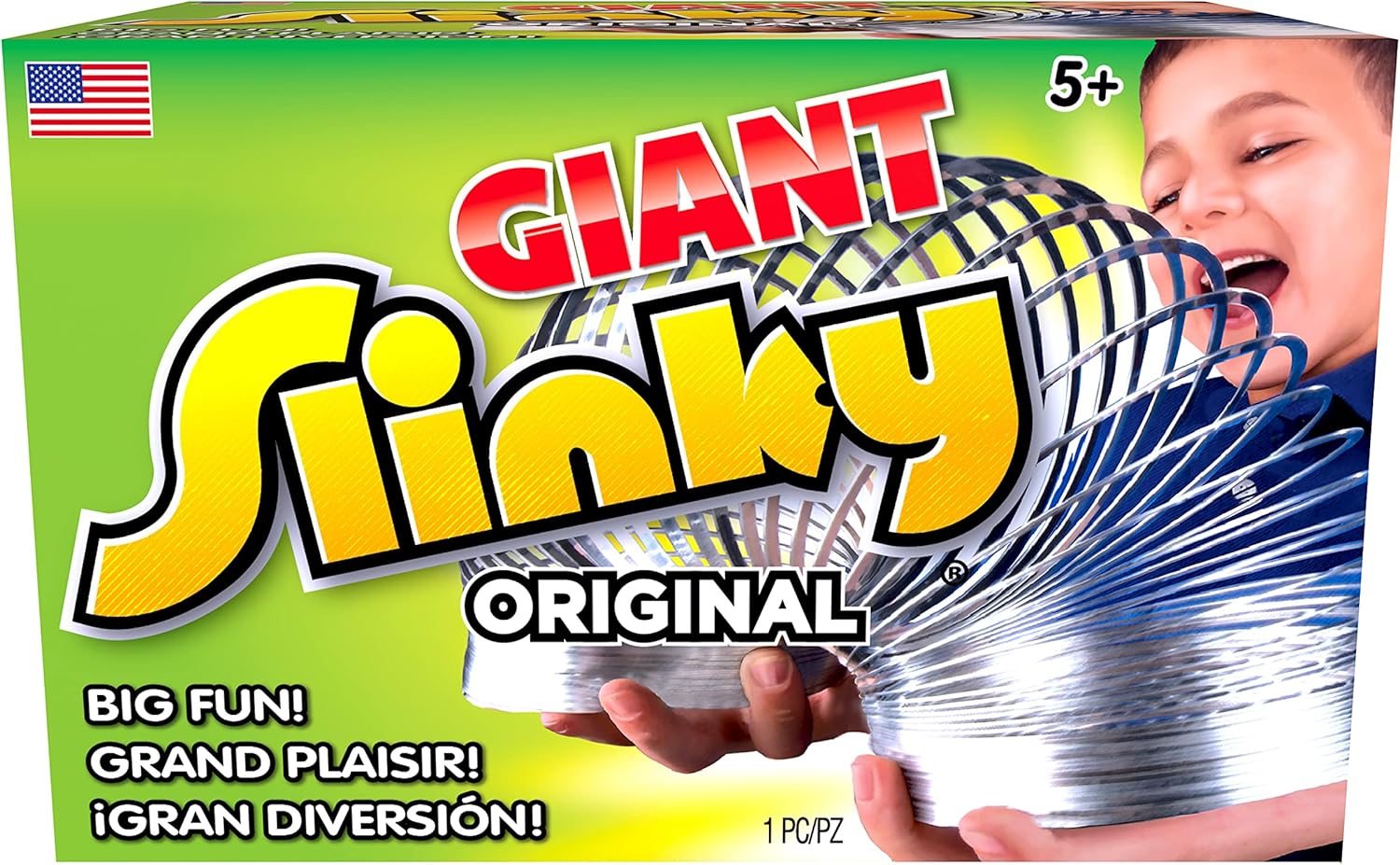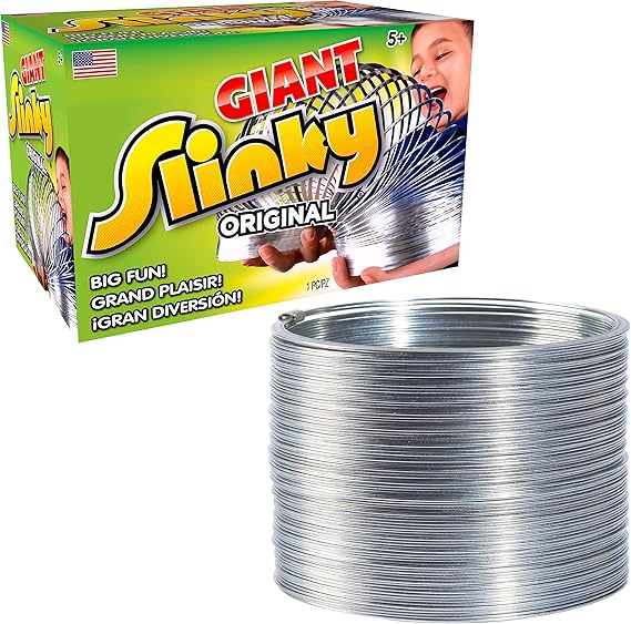 The Original Giant Slinky " Super-Sized Metal Walking Spring Toy Get ready for bigger, wilder, and more exciting Slinky fun with the Original Giant Slinky! This super-sized version of the classic metal Slinky is 70% larger for even more wiggly, jiggly entertainment. Features: Giant-Sized Fun " 70% bigger than the classic Slinky for extra stretch, bounce, and motion. The Original Brand " The same iconic design, just super-sized for bigger laughs and more excitement! Signature Slink-ity Sound " That unmistakable Slinky sound brings rhythm and fun to playtime. Endless Entertainment " Walk it down the stairs, stretch it, wiggle it, and discover hours of creative play. Great for All Ages " A timeless toy that kids ages 5 and up, as well as nostalgic adults, will love. Perfect for Family Fun " Use it as a fidget toy, desk accessory, or party favor"the possibilities are endless! A Classic with a Giant Twist! Since its invention in 1943, over 300 million Slinkys have been sold worldwide. Inducted into the National Toy Hall of Fame, this beloved retro toy continues to inspire creativity across generations. Now, with the Giant Slinky, the fun is bigger and better than ever!