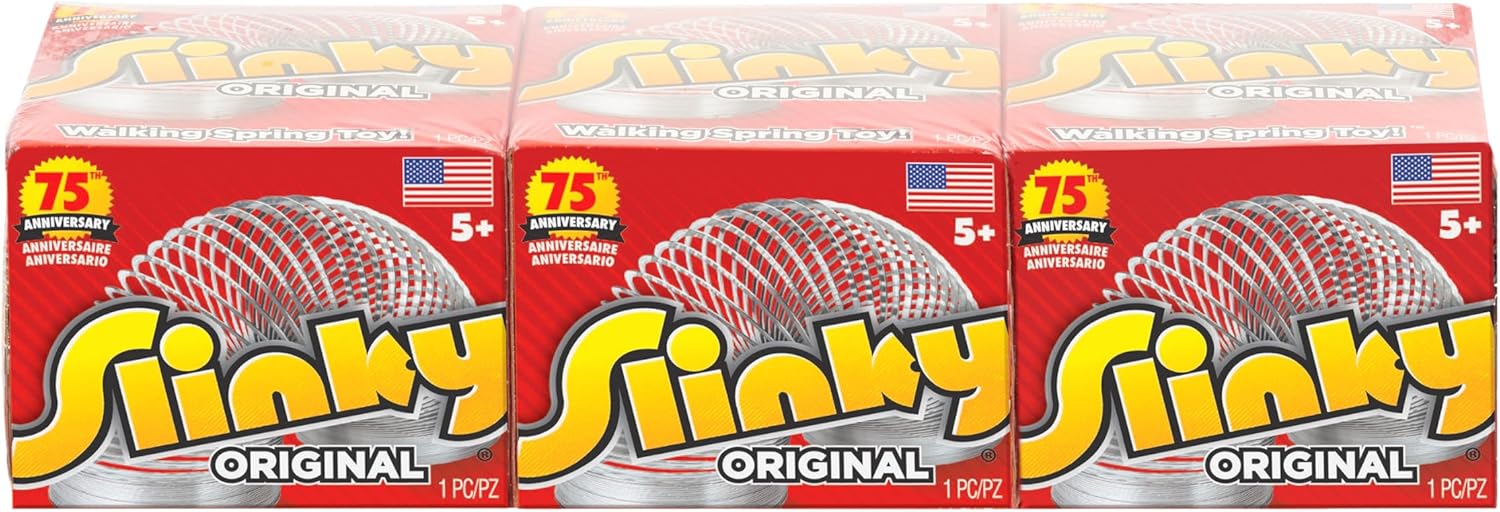 The Original Slinky " 3-Pack Metal Walking Spring Toy Get ready for classic, wiggly fun with The Original Slinky! This iconic metal spring toy has been entertaining kids and adults for over 75 years. Features: Authentic Original Slinky " The classic metal design that's been loved for generations. Set of Three " Includes three 2.75-inch diameter metal Slinkys for triple the fun. Endless Entertainment " Watch it stretch, wiggle, walk downstairs, and make its signature slink-ity sound! Perfect for All Ages " Great for kids ages 5 and up, as well as nostalgic adults. Timeless Toy " Originally invented in 1943, inducted into the National Toy Hall of Fame, and still a favorite today! Great for Any Occasion Use it as a fidget toy, desk accessory, party favor, or just to relive the joy of a classic childhood toy. Everyone loves a Slinky!