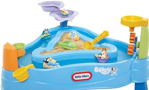 Product Description Your child will have a blast splashing around on this interactive water table with Bluey & friends! With its triangular design and interactive table layout, this play set is perfect for hours of outdoor playtime with multiple kids. The Bluey-themed accessories encourage imaginative play, and the sand and water setup create a fun sensory experience for children. Key Features: SPLASH WITH BLUEY a This water tableaTMs fun design encourages social and imaginative playtime where multiple kids can have fun together for hours Its Bluey-themed accessories encourage imaginative play and a fun sensory experience with water and sand (not included).,DETAILED LAYOUT a This table is intricately designed with special details to enhance childrenaTMs playtime experience The outer ring forms a fun aLazy Rivera for kids to splash and play with, and the inner triangular cavity is perfect for holding sand or more water The table also features two cascading pools, a tipping bucket, and a water funnel with spinning gears.,BLUEY & FRIENDS a Features four Bluey characters that easily float in the Lazy River Kids can play with Bluey, Bandit, Chili, and Bingo in the water and sand.,2-IN-1 DESIGN: The detachable legs on this 2-in-1 water table allow for an easy switch between table and floor play.,EASY TO CLEAN & STORE a Functional drains and drain plugs allow for easy cleaning This product is designed with premium quality, ensuring durability and superior performance.