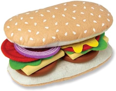 Product Description Create piled-high sandwiches, made to order with this wooden sandwich counter play set with all the fixinaTMs! The sturdy wooden deli counter includes a play meat and cheese slicer for the wooden play food, and felt sandwich roll and toppings to create sandwiches ordered from the menu. There is a wooden dressing bottle, play snacks, and a cup with drink insert to round out meals that customers can pay for with the included play money! An illustrated guide helps with sandwich prep and shows kids how to use the slicer. Key Features: Create piled-high, deli-fresh pretend play sandwiches with this 52-piece sandwich counter,Play food includes wooden meat and cheese slices, felt toppings and sandwich roll, wooden dressing bottle, play chips, cookie, and drink cup with insert; play money included,Counter includes a slicer for wooden meat and cheese pieces, sign with menu on one side and sandwich prep instructions on the other,Helps encourage counting, sorting, and fine motor skills, as well as imaginative play and storytelling,Makes a great gift for preschoolers, ages 3 to 6, for hands-on, screen-free play,13.5a x 8a x 8.5a This product is designed with premium quality, ensuring durability and superior performance.