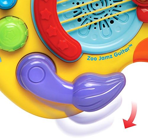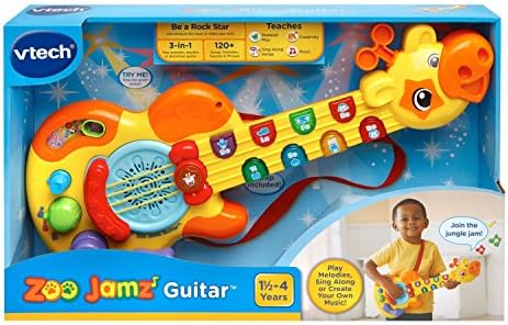 Product Description Product Description Rock and learn with the Zoo Jamz Guitar by VTech. Join the animal band and play along with the silly giraffe. The eight light-up buttons and strings allow your little musician to jam to the included music or make their own. The light-up buttons also add funny animal sounds to the melody. Sing along to eight familiar tunes with the giraffe. Turn the dial to choose acoustic, electric or distortion guitar to learn about different types of guitar sounds. Key Features: Eight light-up buttons and strings allow your little musician to jam to the included music or make their own; light-up buttons also add funny animal sounds to the melody,Sing along to eight familiar tunes with the giraffe; play along to kid-friendly songs or create your own music; be a rock star with the cute giraffe,Turn the dial to choose acoustic, electric or distortion guitar to learn about different types of guitar sounds; giraffe's tail plays cool guitar effects,Animal band button lets you play with the zebra from Zoo Jamz Piano and the lion from Zoo Jamz Microphone (each sold separately),Requires 2 A batteries (batteries included for demo purposes only; new batteries recommended for regular use); intended for ages 18 months to 4 years This product is designed with premium quality, ensuring durability and superior performance.