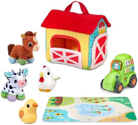 Product Description Get ready for a day on the farm with this plush barn, tractor, four animal friends and explorative play mat! Open the barn door and bring out the soft horse, cow, chicken and duck for their daily adventures. Hear the duck squeak or cow crinkle when little ones squeeze them, introducing cause and effect reactions. Keep the excitement going by rolling out the tractor to hear barnyard phrases and sounds as curious cuties drive it around, or press the buttons for songs, melodies and animal sounds. Key Features: Press the buttons or roll the tractor to engage fingers and ears while introducing animal sounds, farm phrases, songs and melodies,Grab the plush horse, cow, chicken or duck to work mini muscles; squeeze the duck or cow for a squeaky or crinkly surprise,Encourage imagination with the patterned play mat; take the animals through a sunflower field, apple or carrot picking, or resting at the pond,Easily pack everything in the barn and take the animals around town, or for quick and easy storage when playtime is over,Intended for ages 6+ months; requires 1 A battery; battery included for demo purposes only; new battery recommended for regular use This product is designed with premium quality, ensuring durability and superior performance.