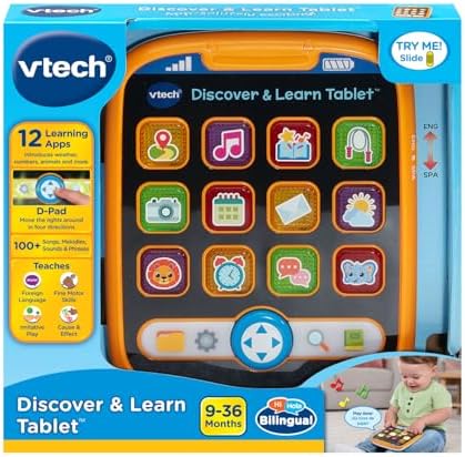 Product Description Today is a great day for play, according to the weather app on this first tablet for little ones. Check email or the weather, play music and say hello to animal pals by pressing the colorful light-up buttons on this perfectly portable toy. Hear age-appropriate vocabulary including animals and numbers through phrases and sing-along songs. Flip the switch to choose between English and Spanish. Use the directional button to create a light show by moving it up, down, left or right to draw little ones further into the excitement. Intended for ages 9-36 months. Key Features: Perfect for little ones, this first tablet doesnaTMt need Wi-Fi to explore 12 exciting apps,Just like a grown-up tablet, explore a variety of apps with age-appropriate vocabulary through playful phrases and sing-along songs,Strengthen fingers with easy-to-press light-up app buttons and use the directional pad to move the lights around,No need to download a language app, slide the switch to hear numbers, weather and phrases in Spanish,Intended for ages 9-36 months; requires 2 AA batteries; batteries included for demo purposes only; new batteries recommended for regular use This product is designed with premium quality, ensuring durability and superior performance.