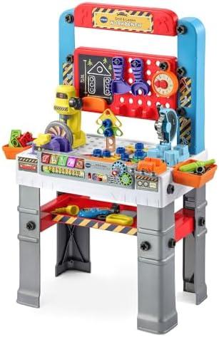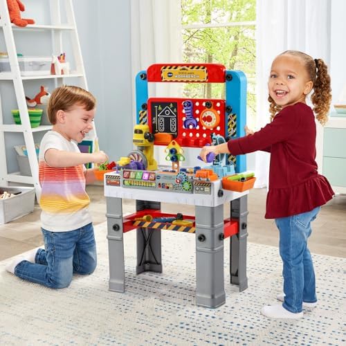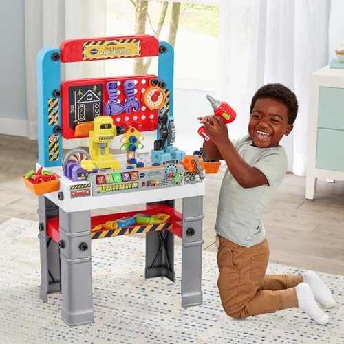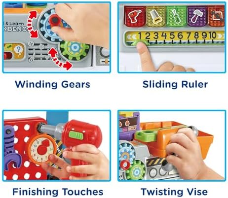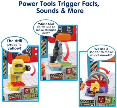 Product Description What do you want to build today? Get started with the Drill and Learn Workbench. The workbench can be assembled for the first DIY project using the included power tools. Then, use the hand tools to hang the clock on the peg board with the wrench or screw in the pegs to hang the tools. Three cool power tools make quick work of any project. Explore the drill press, sander, and circular saw, and hear sounds and facts about each one when placed on the bench. Key Features: LetaTMs build something! Start with simple projects using the hand tools then add more power and explore the drill press, sander and circular saw,Includes nine exciting project ideas or get creative and make something special with the included tools and building pieces,Use the drill, saw, screwdriver, vise and hammer to hear their colors and a little joke,Three tool-riffic modes let little builders explore tools, listen to music and show of their discoveries with fun quizzes,Intended for ages 3-6 years; requires 2 A batteries; batteries included for demo purposes only; new batteries recommended for regular use This product is designed with premium quality, ensuring durability and superior performance.